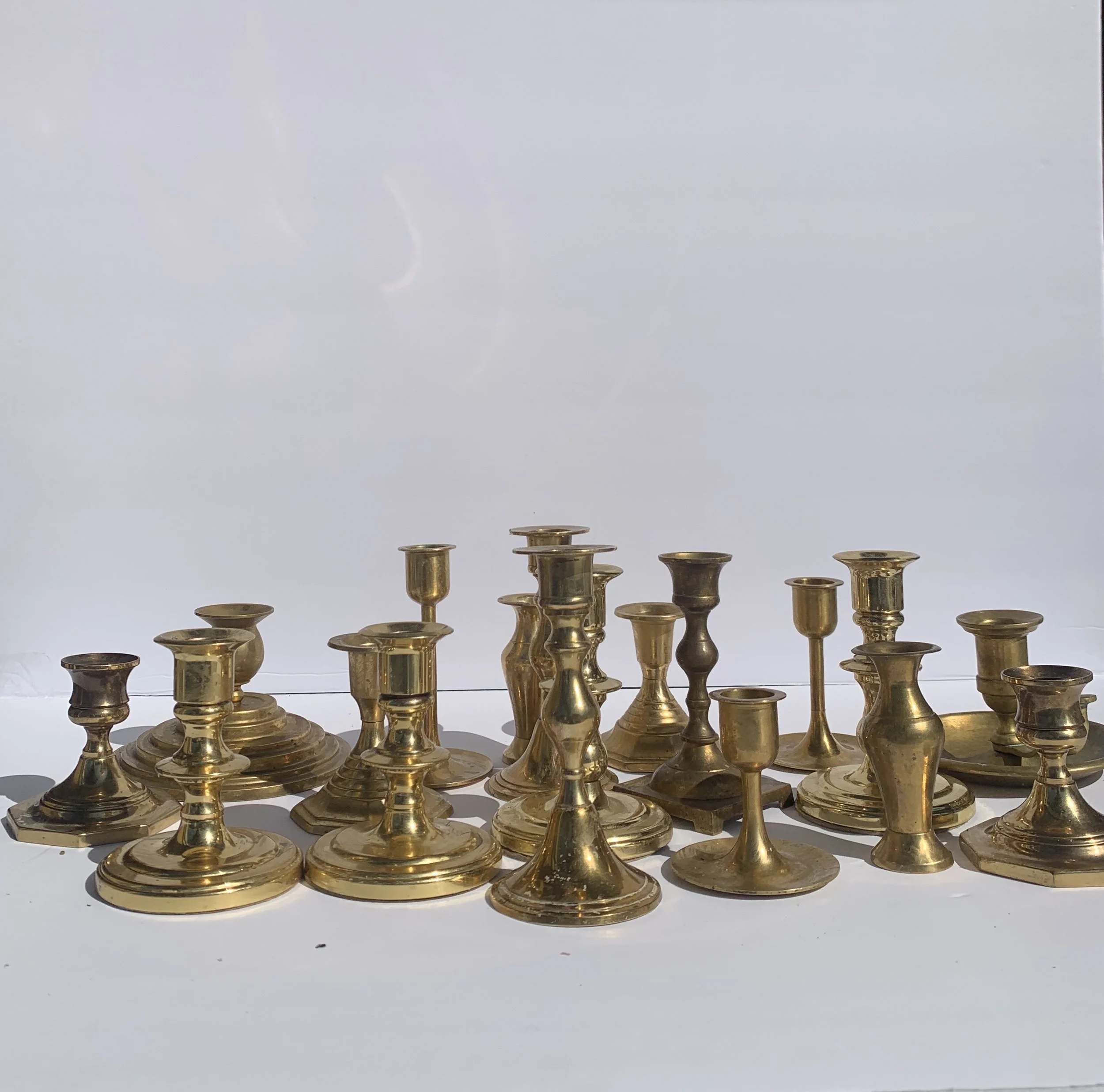 This short brass candle set includes 18 unique candle holders, it can be rented as a full set, half set, or along with our tall brass candle set for a real dramatic look!